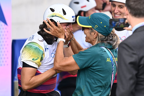 Jessica Fox reacts with mother and coach former Olympic canoeists Myriam Fox-Jerusalmi after she won a gold medal in the Women’s Kayak Single Final