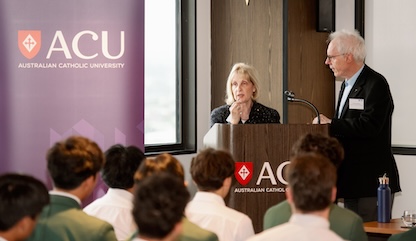Jillian Segal speaks to students with ACU’s Fr Gerald Gleeson (supplied)