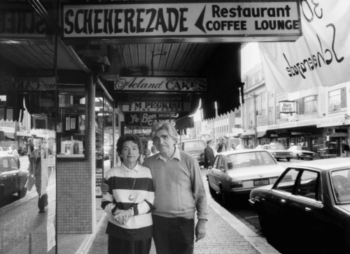 Masha and Avram outside Café Scheherazade