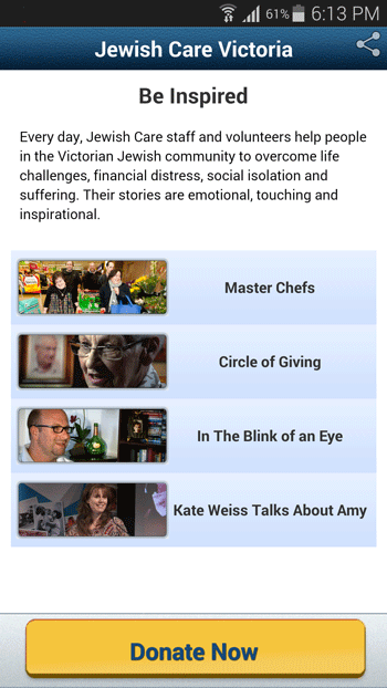 Most importantly, for Jewish Care, the apps value lies in its ability to provide it supporter’s fingertip access to donate at the touch of a button. The app’s secure donation module gives repeat users a simple one-click process to donate. Tax receipts are instantly emailed to the donor and a full record of all transactions are stored in the user’s account.