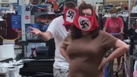 A couple was confronted at a Walmart in Marshall, Minn., on July 25, 2020, for wearing Nazi flag face masks. Credit: Raphaela Mueller/Facebook.