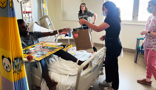 The teens spent the day baking treats, choosing toys and books to go into the bags and then travelled to the hospital to deliver them to the patients personally.