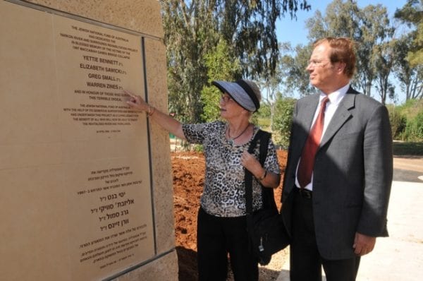 shows her late husband's name to Efi Stenzler,World Chairman of KKL-JNF”] shows her late husband’s name to Efi Stenzler,World Chairman of KKL-JNF”]lynne-zines1Present at the dedication was Sydney-based Lynne Zines, whose husband Warren was one of the victims.