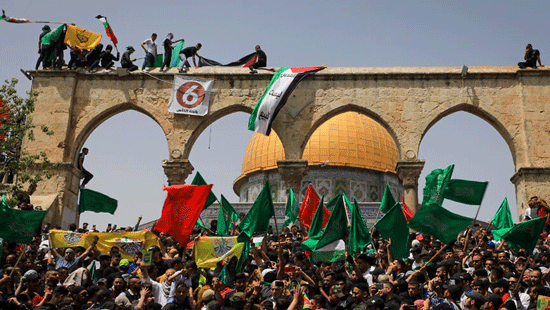 Palestinians wave flags and shout slogans as Muslim worshippers attend the last Friday prayers of the month of Ramadan at the Al-Aqsa mosque compound in Jerusalem’s Old City on April 29, 2022. Photo by Jamal Awad/Flash90.