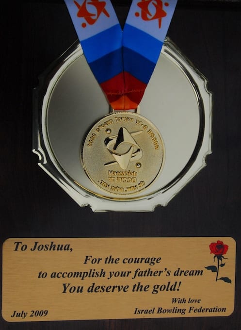 Josh did not win a medal in competition but was surprised when he was singled out for two awards at the medals ceremony. He received a Maccabiah Gold Medal on a plaque bearing the words “For the courage to accomplish your father’s dream. You deserve the Gold.”