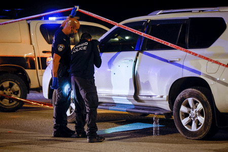 Israeli security forces guard at the scene of a shooting attack in Bet Ha’Arava Junction in the Jordan Valley on Feb. 27, 2023. Photo by Erik Marmor/Flash90.