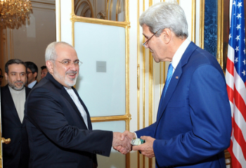 Former U.S. Secretary of State John Kerry (right) with Iranian Foreign Minister Mohammad Javad Zarif as he arrives at a hotel in Vienna, Austria, on July 14, 2014, for a day of meetings about Iran’s nuclear program. Credit: U.S. State Department.