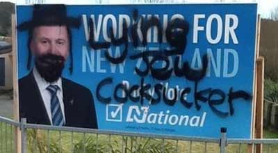 President of the New Zealand Jewish Council Stephen Goodman told J-Wire: “The New Zealand Jewish community is concerned about the rise in antisemitic acts and statements being made at present. New Zealand has been a country where we have been free to practice without fear of threats, hate speech or vilification. Recent activity, such as the defacing of John Key’s billboards and actions associated with political rallies, is an unacceptable. It must be dealt with swiftly; it has no place in our culture.