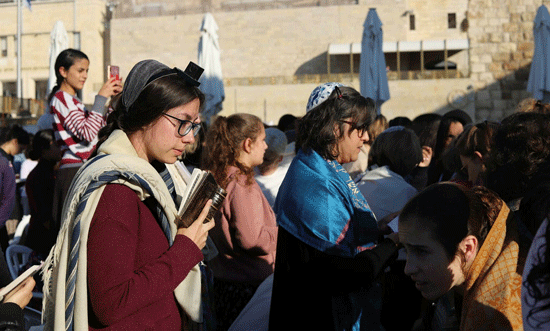 “Women of the Wall” wearing a kippah and tallit, celebrating with orthodox women the new month of Heshvan, at the Western Wall in the Old City of Jerusalem. Jerusalem, Oct 30, 2019. Photo by Hodaya Kalman/TPS