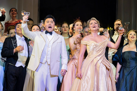 Alfredo, Violetta’s admirer, sung by South Korean tenor Ji-Min Park was significantly overshadowed in their initial duet, in both voice and acting, however he recovered in Act 2 and during the remainder of the opera.