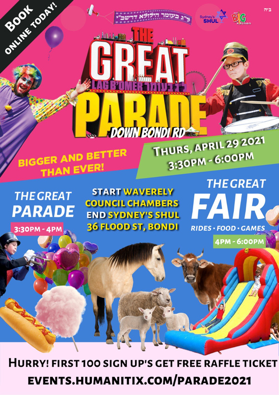 Sydney’s Shul and Our Big Kitchen have organised the “Great Lag B’Omer Parade” for this coming Thursday.