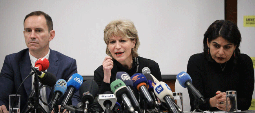 Secretary General of Amnesty International Agnes Callamard (C) attends a press conference in East Jerusalem, on February 1, 2022. Photo by Flash90