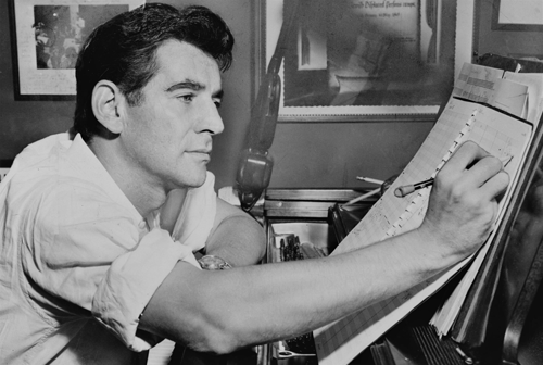 American Jewish composer Leonard Bernstein seated at piano, making annotations to a musical score, 1955. Credit: Al Ravenna, World Telegram Staff Photographer via Wikimedia Commons.