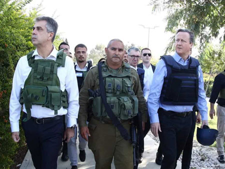 British Foreign Secretary David Cameron (right) and Israeli Foreign Minister Eli Cohen (left) visit Kibbutz Be’eri in southern Israel on Nov. 23, 2023. Photo by Miri Shimonovitz/MFA.