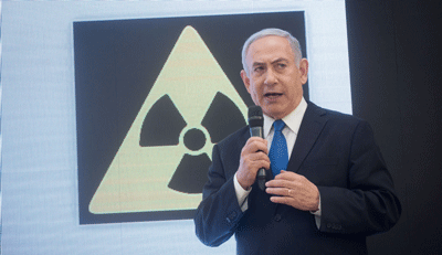 Israeli Prime Minister Benjamin Netanyahu exposes a trove of Iranian documents on Tehran’s nuclear program at a press conference at the Kirya government headquarters in Tel Aviv, April 30, 2018. Photo by Miriam Alster/Flash90