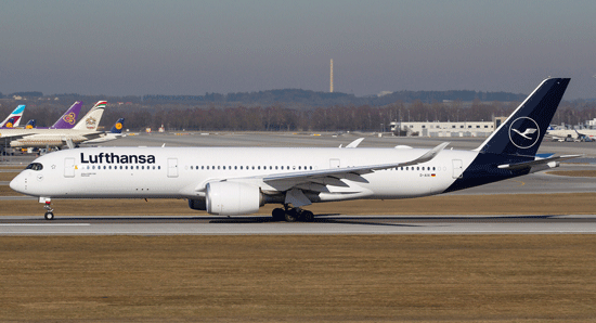 Lufthansa Airbus A350 during takeoff at Munich International Airport, February 2019. Credit: Juke Schweizer via Wikimedia Commons.