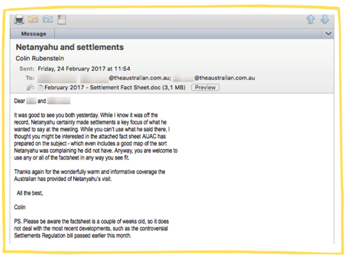 Subsequent to the briefing, Rubenstein sent the two editors from the Australian who attended an email providing a factsheet on one of the subjects Netanyahu had addressed that they could use if they wished to cover the issue more generally, given the agreed ground rules that the actual private meeting was off the record.