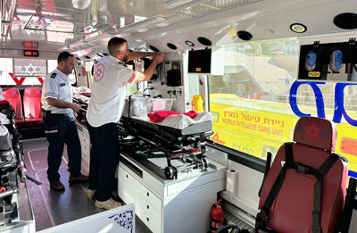 The new bus, the first of its kind in Israel, joins MDA’s fleet of intensive care buses. It was designed and built based on lessons learned from Black Saturday and can treat multiple patients simultaneously using advanced medications, a sophisticated oxygen system that provides oxygen to all patients at once, advanced intensive care equipment including monitors, ventilation equipment, resuscitation tools, 220V electric sockets next to each bed, and compatibility with ECMO devices. The bus is staffed by professional medical teams trained specifically for this purpose. Loading patients onto the bus is done via a unique, sophisticated hydraulic loading device that opens from the side of the bus.