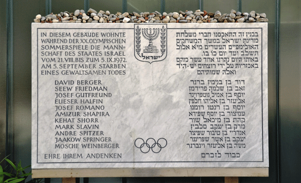 A plaque in front of the Israeli athletes’ quarters commemorating the victims of the 1972 Munich Olympics massacre reads, in German and Hebrew: “The team of the State of Israel lived in this building during the 20th Olympic Summer Games from 21 August to 5 September 1972. On 5 September, [list of victims] died a violent death. Honour to their memory.” Credit: Wikimedia Commons