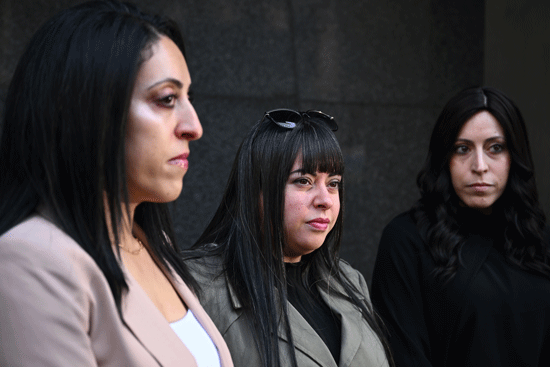 Elly Sapper, Dassi Erlich and Nicole Meyer speak to media as they arrive at the Victorian County Court in Melbourne on Thursday, August 24, 2023. (AAP Image/Joel Carrett)
