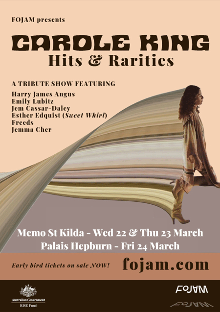 Tickets are selling fast for Carole King – Hits and Rarities on Wed 22 & Thu 23 at Memo Music Hall, St Kilda and Fri 24 March at Palais-Hepburn, Hepburn Springs. Seated and Standing tickets are now on sale at www.fojam.com.