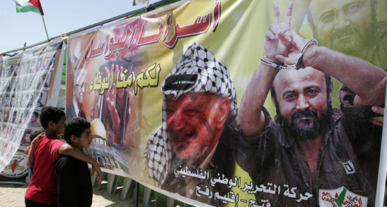 Palestinian children look at the image of PLO chief Yasser Arafat and terrorist Marwan Barghouti during a demonstration in the southern Gaza Strip calling for the release of prisoners held in Israeli jails on Oct. 6, 2011. Photo by Abed Rahim Khatib/Flash90.