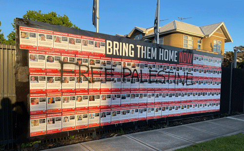 He said: “Last night at Beth Weizmann, we mourned for those innocent victims of the State of Israel. This morning, we grieve at the sorry state of multiculturalism here in Victoria, where a community centre can be the target of graffiti and images of helpless hostages can be vandalised.”