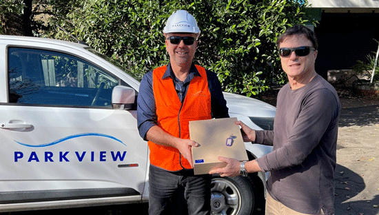 White City Project Director Robert Woolf hands over the keys to White City to Parkview Constructions Project Manager Michael Kandylas responsible for the delivery of the new Hakoah