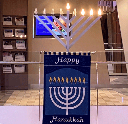 On the Ovation, the empty glitter and tinsel of the yuletide trees and other decorations that had been set up on the main decks were somehow eclipsed by all the other general razzamatazz on display. However, a giant electric Menora had been set up on an elevated section at the very centre of the upper main deck with a prominent banner proclaiming Happy Hanukkah. The way it was positioned, it appeared to dominate everything around it!