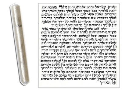 A mezuzah is a case that consists of a scroll with verses from the Torah, including the “Shema,” which states, “Hear, O Israel, the Lord is God, the Lord is one,” and mentions the biblical commandment to have a mezuzah on the doorposts of entrances to one’s home or gate.