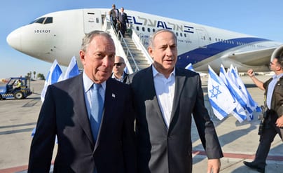 ormer New York City mayor Michael Bloomberg (left) is pictured with Israeli Prime Minister Benjamin Netanyahu as Bloomberg arrives in Israel on July 23, 2014. At the time, Bloomberg flew to Israel to take a stand against a U.S. Federal Aviation Administration ban on flights to the Jewish state. Credit: Haim Zach/GPO/Flash90.