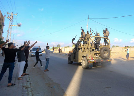 Palestinian terrorists in a stolen IDF vehicle at the Erez Crossing between Israel and the northern Gaza Strip, Oct. 7, 2023. Photo by Atia Mohammed/Flash90.