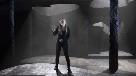 Paul Jackson has turned what upon entry is simply a black “shell-like” stage into a dark-hued chamber of secrets, with trap doors and misshapen light sources. I am in awe of how effective that is.