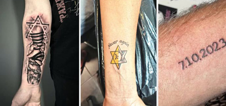 Examples include tattoos featuring yellow stars, the Star of David and the phrase “never again,” as well as the date 7.10.23 tattooed on the arm in a manner similar to identification numbers tattooed on Jews by the Nazis during the Holocaust.