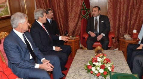 U.S. Secretary of State John Kerry and U.S. Secretary of Defense Chuck Hagel meet with King Mohammed VI of Morocco at the Moroccan Ambassador to the United States’ residence in Washington, D.C., on November 20, 2013. Credit: U.S. Department of State.
