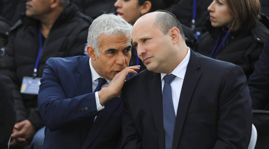 Prime Minister Naftali Bennett and Minister of Foreign Affairs Yair Lapid attend the departure ceremony of the Israeli aid delegation for the establishment of a field hospital in Ukraine on March 21, 2022 at Ben Gurion airport near Tel Aviv. Photo by Marc Israel Sellem/POOL