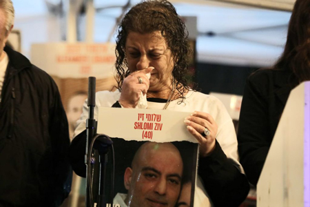 The families of Israeli hostages held in Gaza at a Tel Aviv ceremony marking 100 days since Hamas’s October 7 attacks, on Jan. 14, 2024. Photo by Gideon Markowicz/TPS