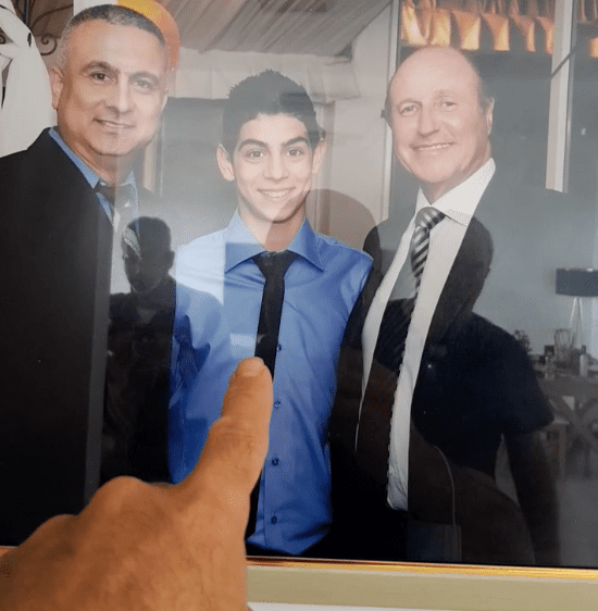 Baruch Ygal points to the photo of himself, Amit and Tom Goldman