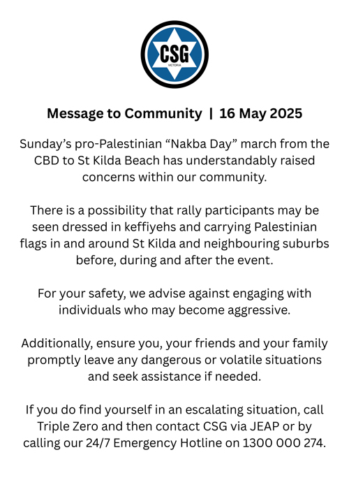 The Victorian CSG has advice ahead of Sunday’s Nakba Day march.