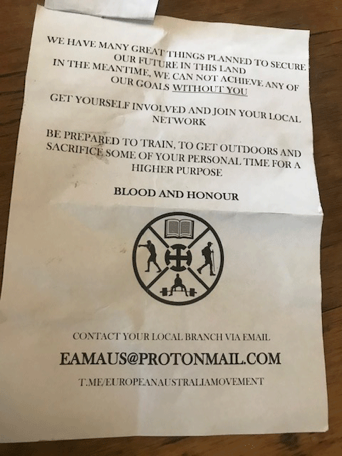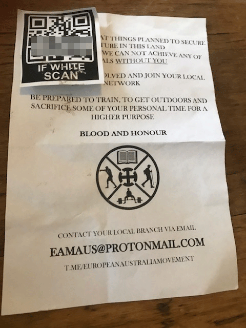 A neo-Nazi group has been distributing white supremacy flyers in the heavily Jewish Sydney suburb of Bondi.