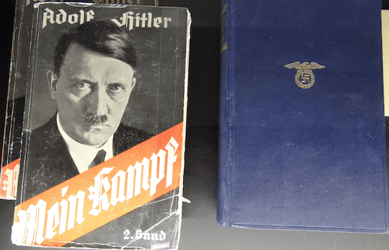 A display of copies of Adolf Hitler’s “Mein Kampf.” Source: Wikimedia Commons.
