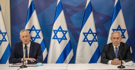 Israeli Prime Minister Benjamin Netanyahu and Alternate Prime Minister and Minister of Defence Benny Gantz hold a press conference in Tel Aviv on July 27, 2020. Photo by Tal Shahar/POOL