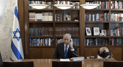 Israeli Prime Minister Benjamin Netanyahu spoke by telephone with U.S. President Donald Trump and UAE Sheikh Mohammed bin Zayed Al Nahyan on Aug. 13, 2020, achieving a historic peace agreement between Israel and the UAE. Credit: Kobi Gideon/GPO.