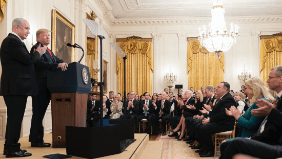 U.S. President Donald Trump delivers remarks with Israeli Prime Minister Benjamin Netanyahu on the details of the Trump administration’s Mideast peace plan on Jan. 28, 2020, in the East Room of the White House. Official White House Photo by Shealah Craighead.