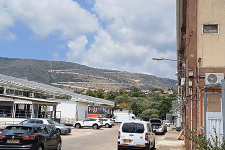 The industrial zone of the northern Israeli town of Shlomi on July 14, 2024. In the background is the border fence and Lebanon. Photo by TPS-IL