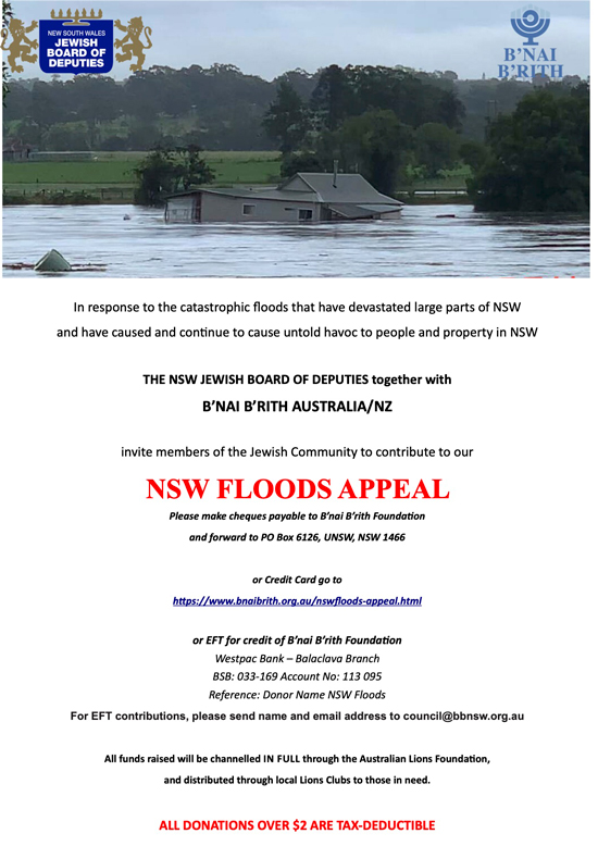 The New South Wales Jewish Board of Deputies and B’nai B’rith have joined forces to raise funds to assist the victims of the recent flooding in NSW.