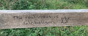 The graffiti read: “The real virus is globalism” with a Star of David accompanying it.