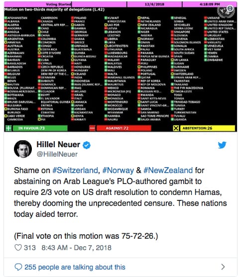 Shamefully, New Zealand’s representative at the UN abstained, unlike most other democratic countries, on whether the double-standard be allowed. The motion passed with 75 countries in favour and 72 against. Hillel Neuer, director of UN Watch, tweeted that, in abstaining, New Zealand had “aided terror”.