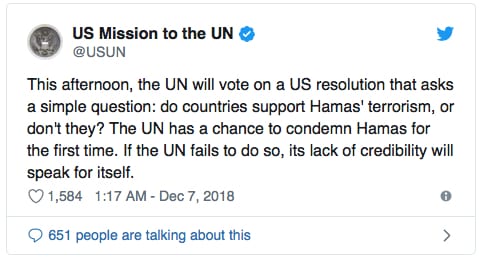 Ahead of the vote on the first ever resolution to name Hamas at the United Nations, the US Mission to the UN tweeted a similar sentiment