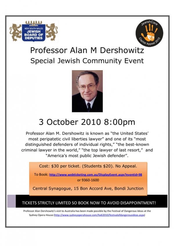 World-renowned Harvard Law Professor Alan Dershowitz will address the Sydney community…in dialogue with Sydney Morning Herald Political Reporter, Peter Hartcher.